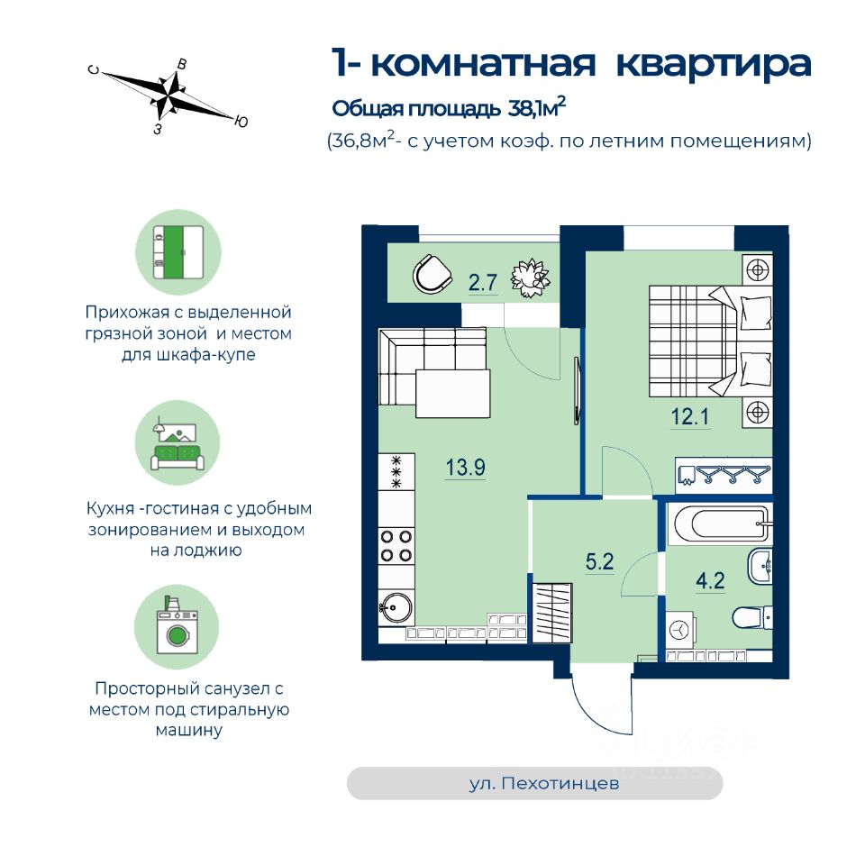 Продаётся 1-комнатная квартира в строящемся доме (Дом 1), срок сдачи: IV-кв. 2025, общей площадью 36.8 кв.м., на 23 этаже. Новый жилой комплекс ''Estelle'' от застройщика ''СЗ Инвестстрой'' расположен по адресу: г. Екатеринбург, улица Пехотинцев.