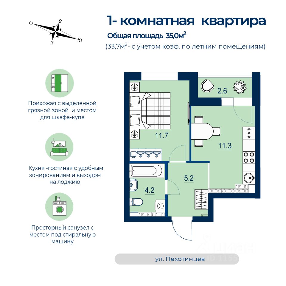 Продаётся 1-комнатная квартира в строящемся доме (Дом 1), срок сдачи: IV-кв. 2025, общей площадью 33.7 кв.м., на 23 этаже. Новый жилой комплекс ''Estelle'' от застройщика ''СЗ Инвестстрой'' расположен по адресу: г. Екатеринбург, улица Пехотинцев.