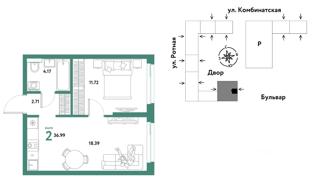 2комнатная квартира площадью 36,99кв. м. на 5 этаже жилого комплекса ''Уральский сад''.