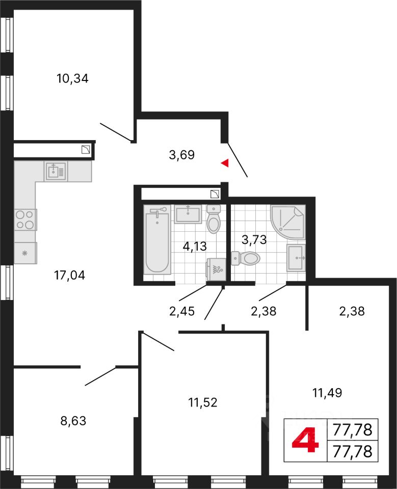 Трехкомнатная квартира с предчистовой отделкой в ЖК ''ДНК. Дом на Куйбышева'' на 19 этаже. Общая площадь: 77.78 кв.м., жилая: 33.35 кв.м., площадь просторной кухни-столовой: 17.04 кв.м. Квартира угловая, очень светлая, естественная вентиляция при открытии окон. В квартире два совмещенных санузла. Высота потолков 2.7 м.
