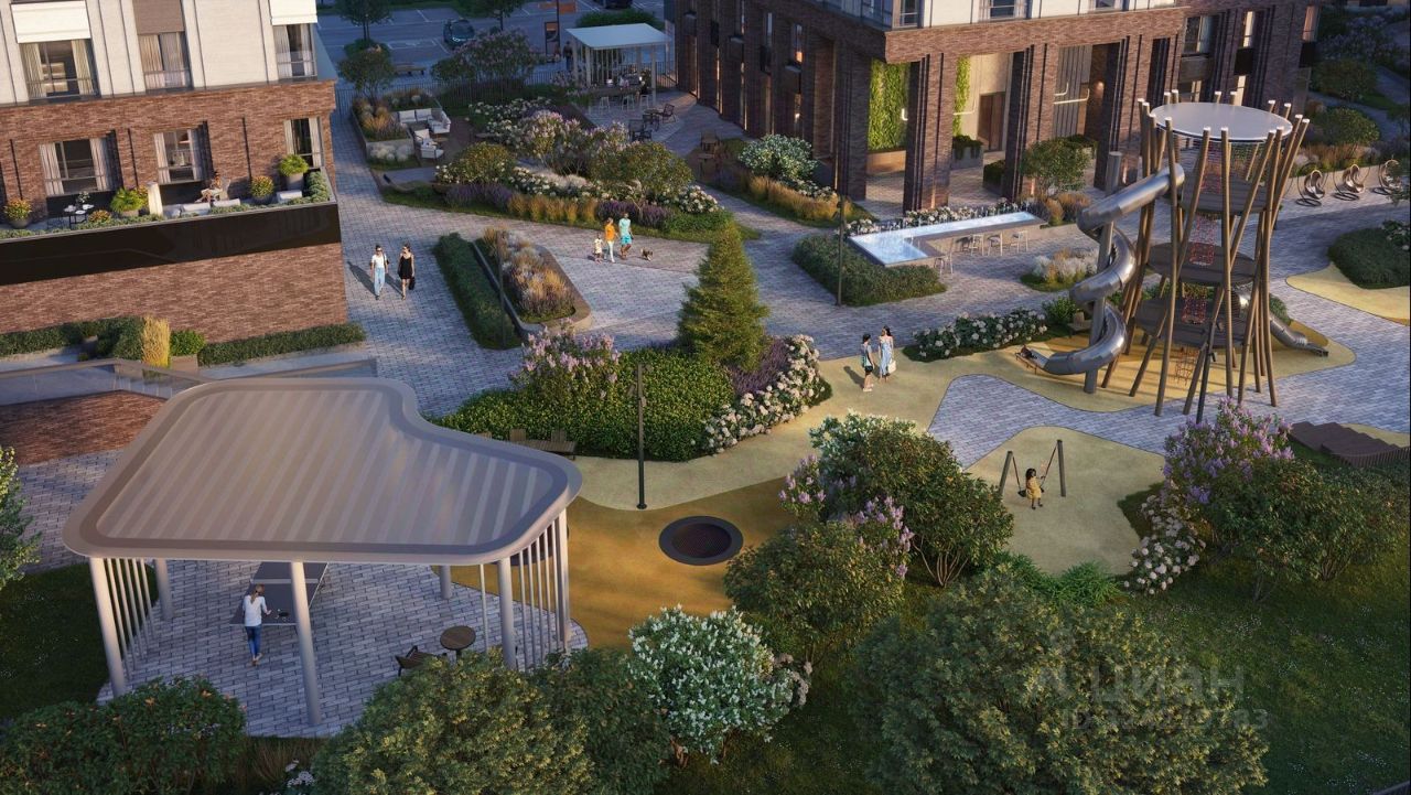 Квартал состоит из четырех 27-этажных домов. В домах — уютные студии, однокомнатные, двухкомнатные, семейные трехкомнатные квартиры. А для ценителей редких форматов квартиры с террасами. Парадный вестибюль с камином и кафе, двор с лаунж-зонами, фонтаном, сенсорным садом, детскими и спортивными площадками внутри.