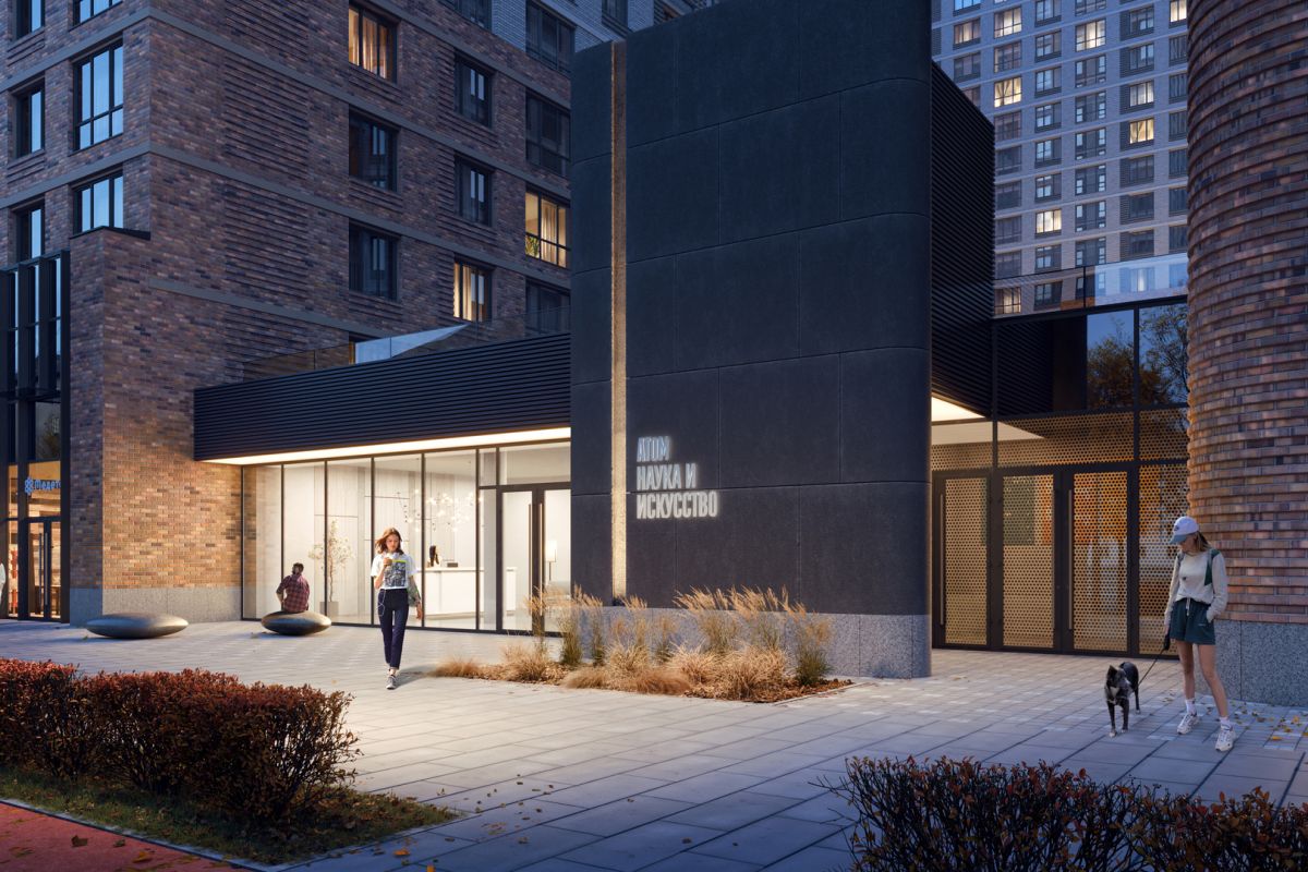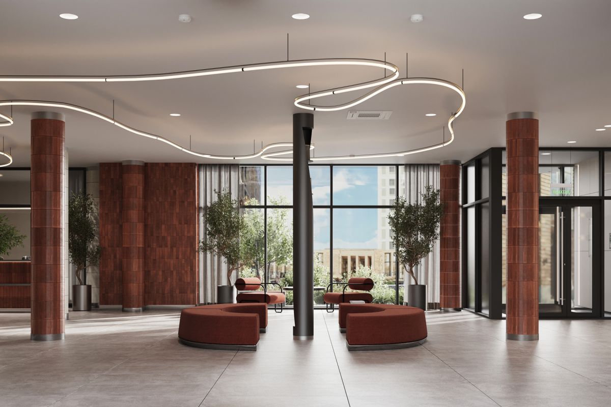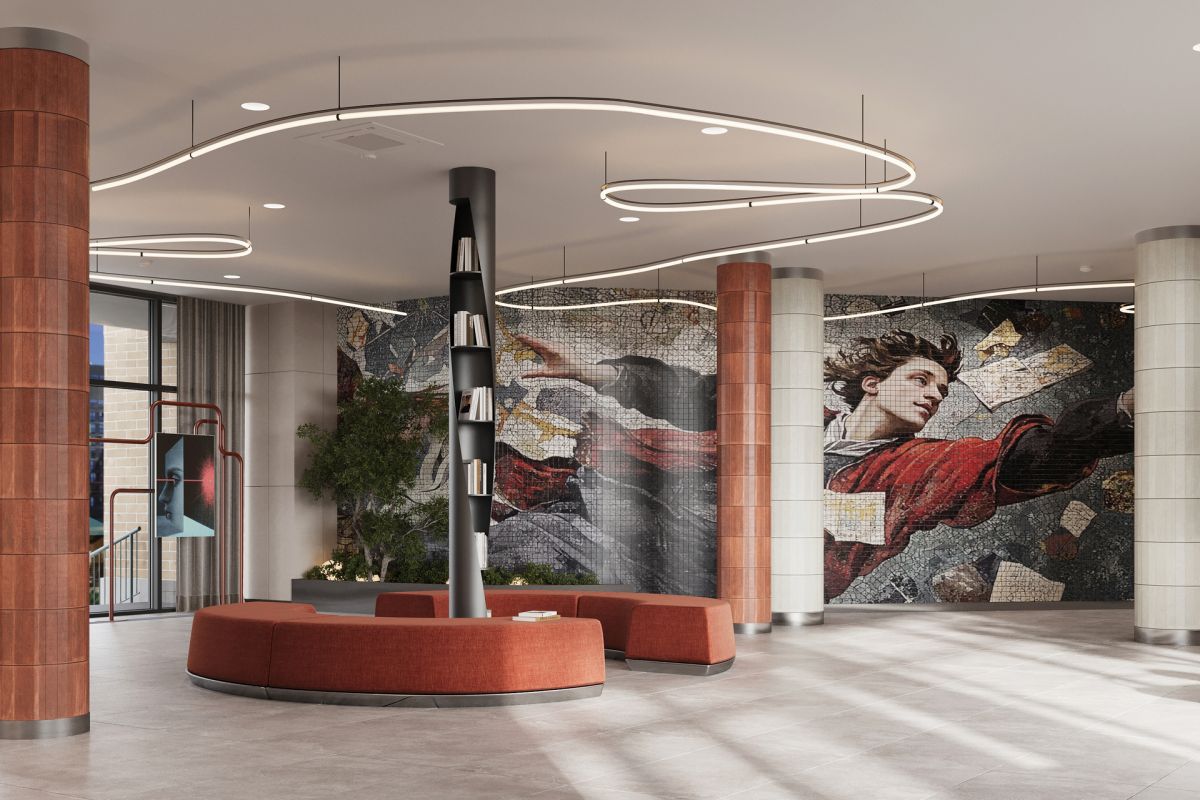 Центральный парадный вестибюль напоминает атмосферу отеля. Высокие потолки, мягкая мебель, кофе-пойнт, стойка управляющей компании, художественное панно во всю стену, креативная подсветка и яркие акценты: круглый стол с шахматной доской, книжный стеллаж в форме молекулы ДНК.